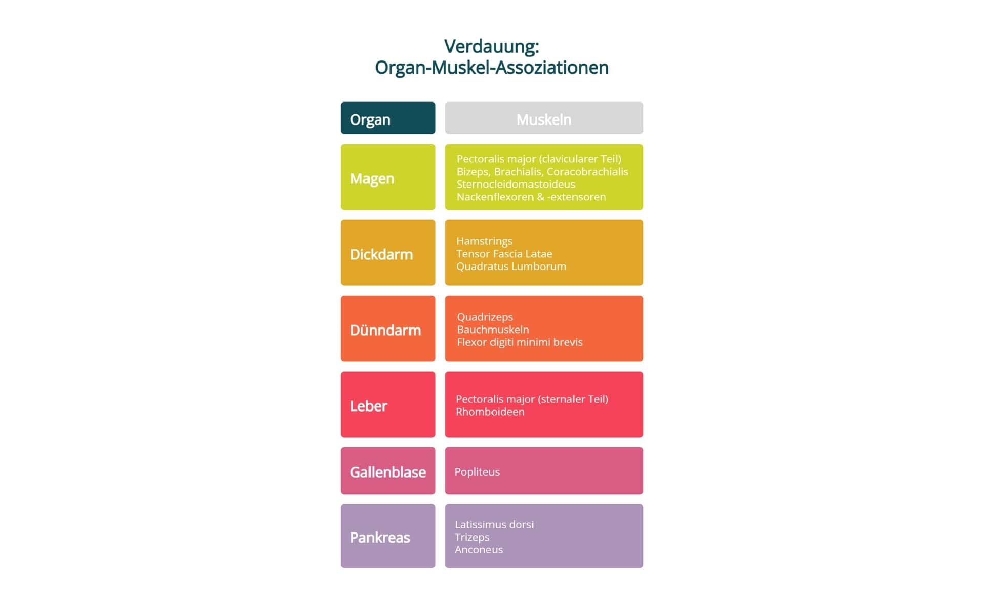 Zurück zu den Organen: Zu jedem Organ gibt’s bestimmte Muskeln, die damit assoziiert sind.